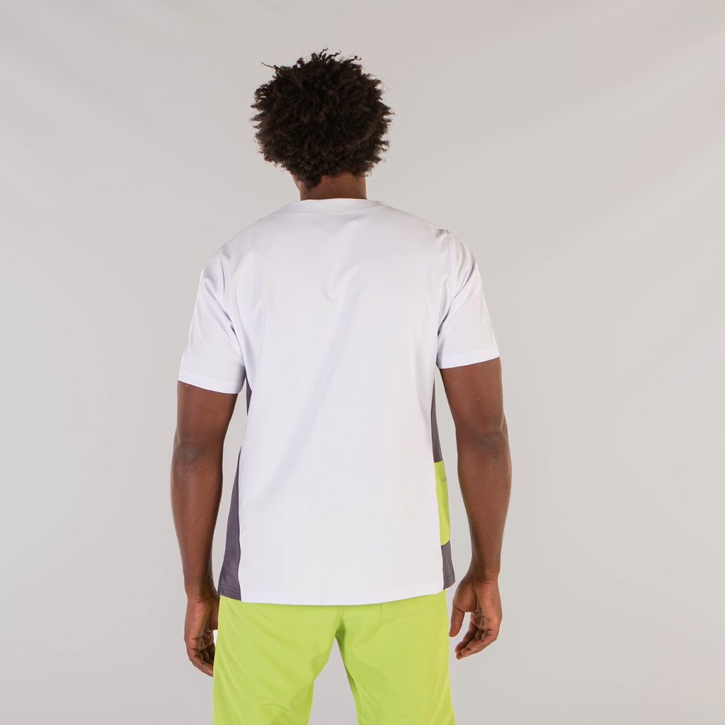 Confeccionada en MICROFIBRA ELASTIK de 99% Poliéster – 1% Elastano, este tejido innovador proporciona máxima libertad de movimiento, es antibacteriano, altamente transpirable y resistente a salpicaduras de lejía. Lavable a 90º, de secado rápido y sin necesidad de planchado, esta casaca es también repelente al cabello y pelo de mascotas. El tejido principal en blanco se combina con detalles en gris y pistacho, acentuados con tejido técnico AEROSILVER en costados y escote.