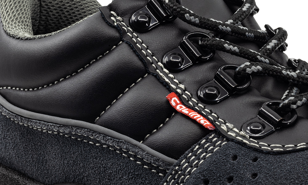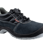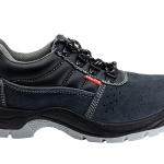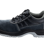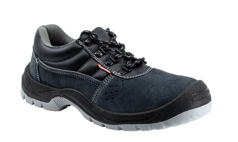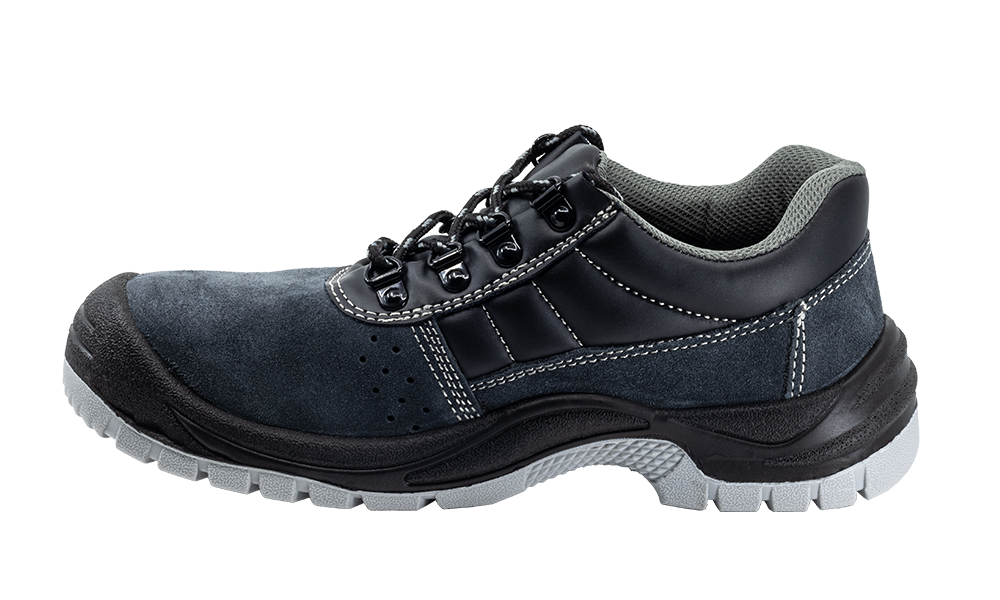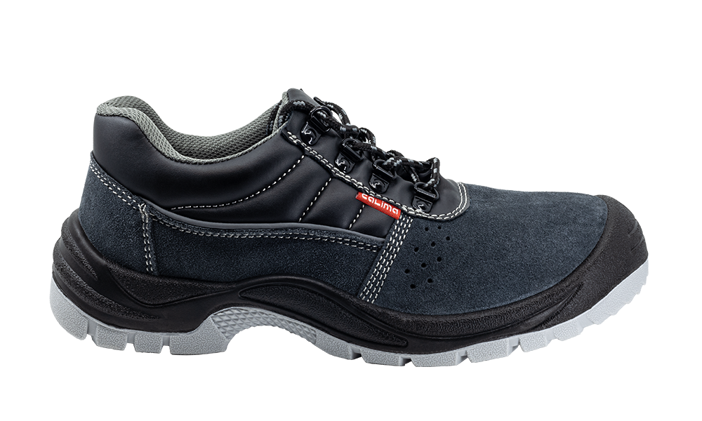 Zapatos corte en piel de búfalo acabado serraje gris, transpirables con forro textil acolchado para evitar rozaduras, suela en poliuretano de doble densidad, puntera de acero y plantilla antiperforación de acero.