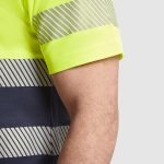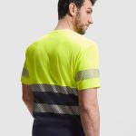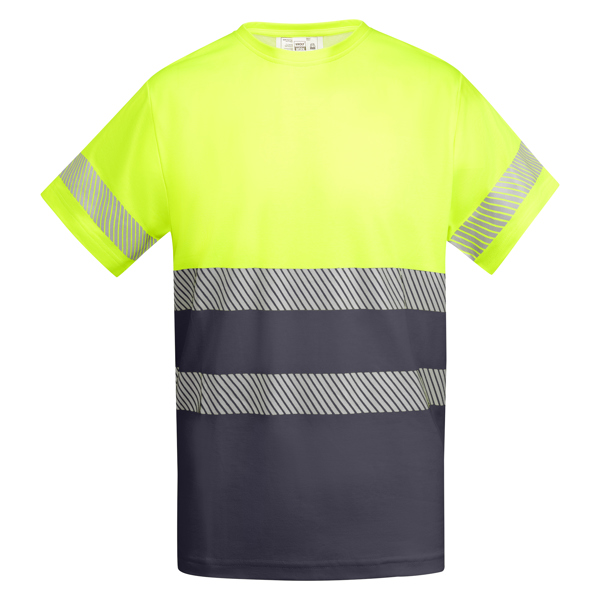 Camiseta técnica de alta visibilidad de manga corta. · Cuello redondo en tejido principal. · Dos cintas reflectantes segmentadas en torso y una en mangas. · Tejido mezcla en poliéster y algodón para mayor comodidad y transpirabilidad.