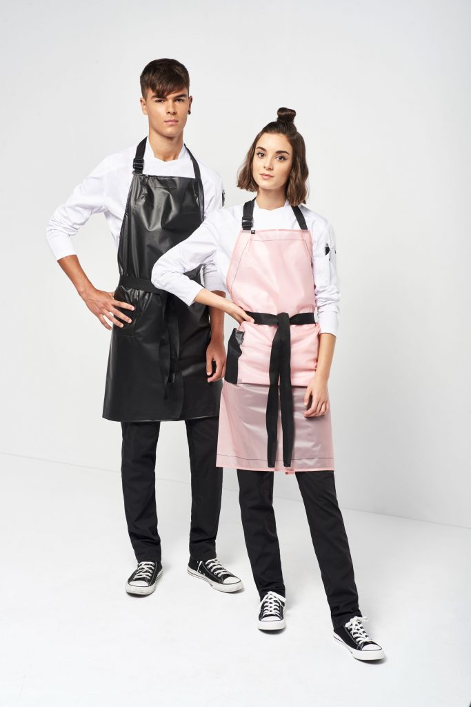 Por el material en el que está fabricado este delantal de cocina está especialmente pensado para personal de office. Con tira de cuello de espiga y regulable con hebilla y cinta de atar también de espiga para más resistencia.