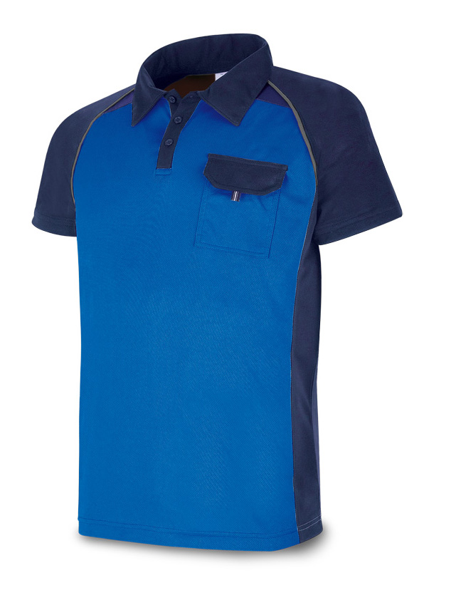 Polo “TÉCNICA” bicolor de manga corta de poliéster 135 gr/m2 fabricado con tejido “BirdEye”, que aporta ligereza y suavidad, y favorece la transpiración. Un bolsillo en pecho ubicado a la izquierda del usuario.