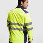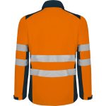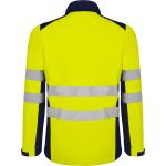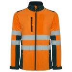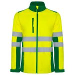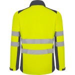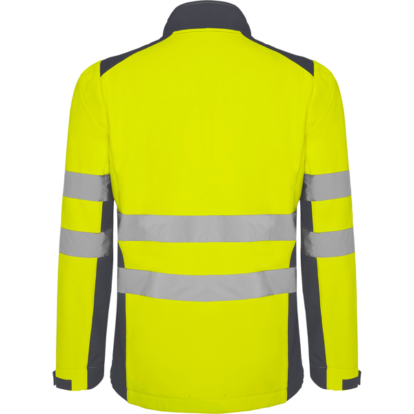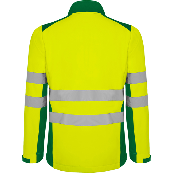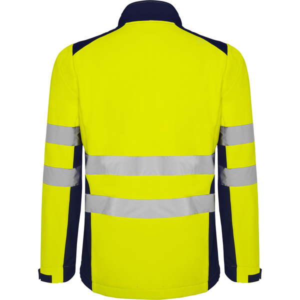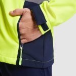Softshell bicolor de alta visibilidad resistente al agua, tejido interior suave de alta capacidad térmica. · Cuello alto, cierre central con cremallera invertida. · Dos cintas reflectantes en torso y mangas. · Tres bolsillos exteriores. · Goma en el interior de la cintura con pulsador para ajustar. · Puños ajustables con velcro.